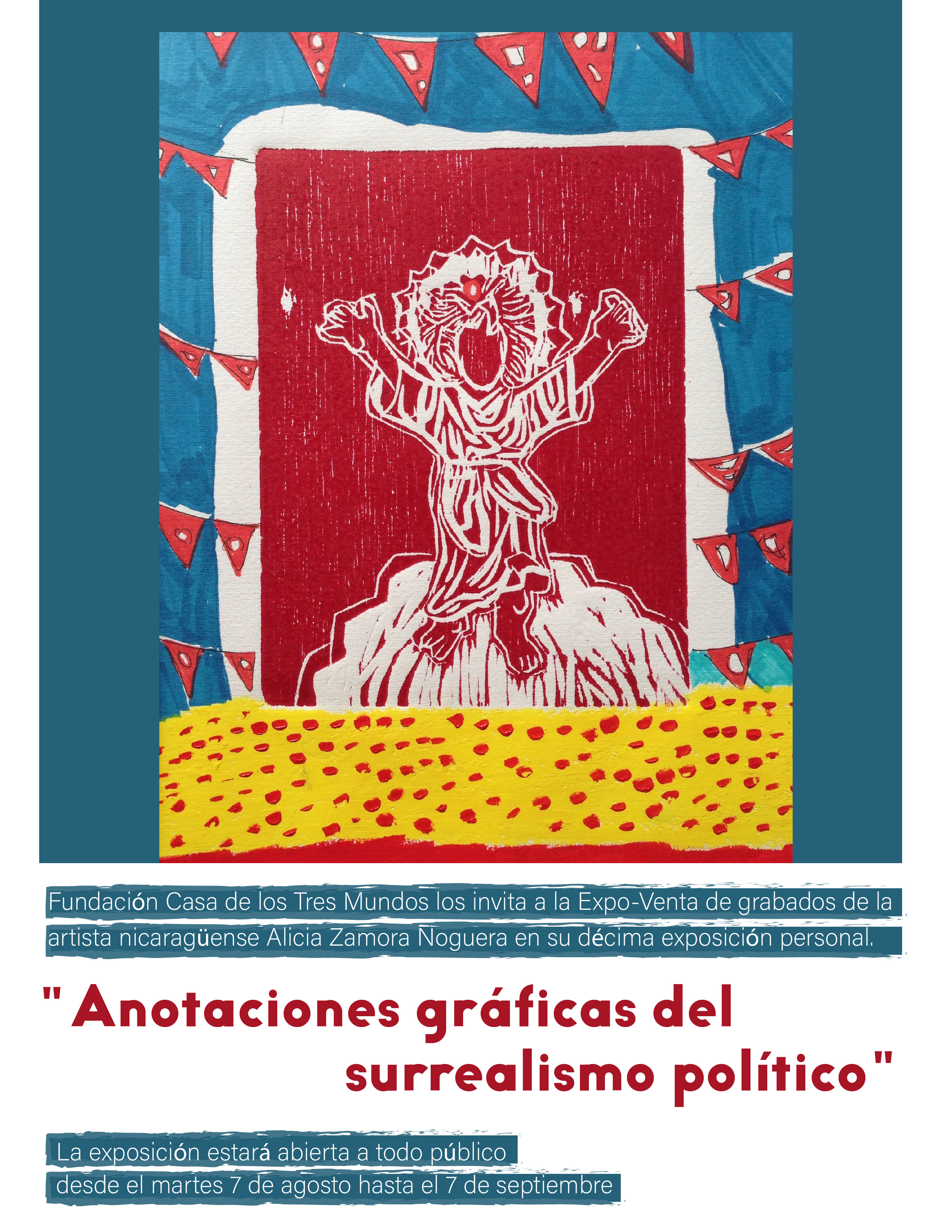 Alicia Zamora Noguera: Artista Visual, socióloga y gestora cultural, Nicaragua, 1978. Como artista de formación autodidacta su trabajo se centra en investigar los diferentes usos del papel en las artes gráficas, en especial en la xilografía, imprimiendo grandes formatos y montando empapelados o wallpaper efímeros. Alicia cuenta con una carrera artística de 22 años de experiencia (1995 – 2017), carrera que inicio recibiendo talleres en la Fundación Casa de los Tres Mundos en Granada y exponiendo como invitada del grupo Artefacto en todas las muestras colectivas que realizaron de 1995 al 2003.